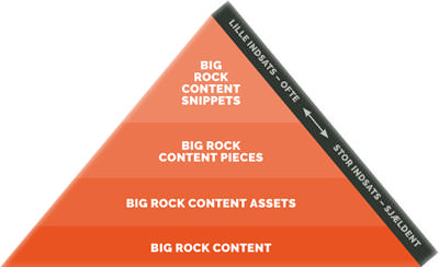 Big Rock Content er et stort tekstbaseret indhold, som eksempelvis kan være udformet som enten en E-bog eller en undersøgelse. Jeres Big Rock Content indeholder al den relevante viden, I måtte have om et konkret emne inden for jeres fagområde. Ud fra dette dokument udarbejdes der mindre ”gated content” dokumenter, Big Rock Content Pieces som eksempel blogindlæg og nyhedsbreve, samt snippets som kan være opslag på eksemplevis Facebook, Twitter og LinkedIn.